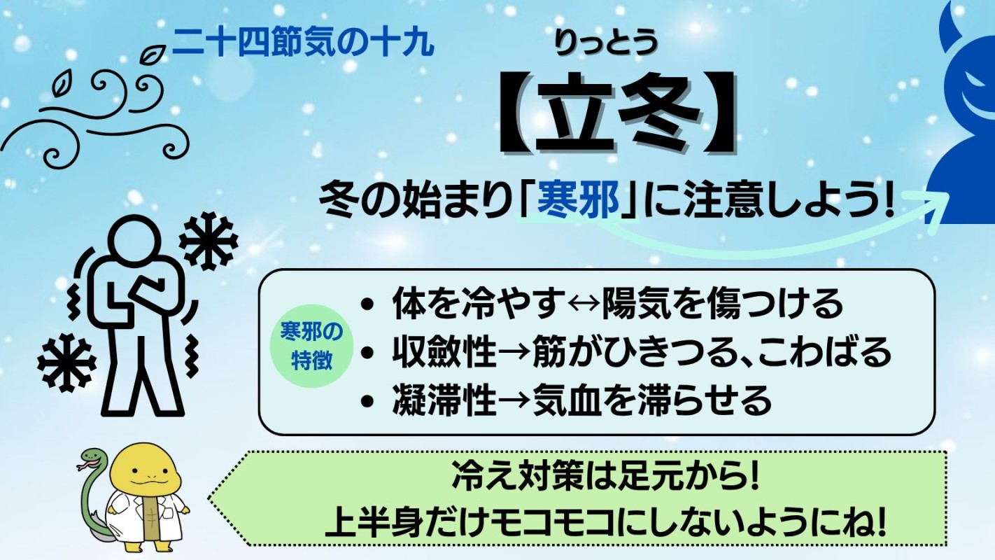 さて(๑و•̀ω•́)و 今日は「立冬」です。 暦の上では今日から冬になります。 冬の養生の基本は ・身体を冷やさない ・無理をしない ・あれもこれもと欲を出し過ぎない ・激しい運動や仕事は控える ・深呼吸を心がける ことです。 特に冬は身体を冷やさない、無理をしないはすごく大事な事です✨️ 飲み会、仕事等、 働いて、働いて、働いて、馬車馬のように働いて、動きっぱなしって(〇〇風)ヾ(=д= ;) たまにはね( ˙꒳˙ ) 身体のアクセル全開、フルスロットルでスピードばかりあっても、どこか雑になることもあるように、何かと 慌ただしくなるこれからの時期。たまに自分のエンジンを 一休みさせてあげませんか(* 'ᵕ' )☆