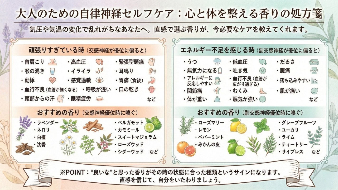 急激な気温低下は、自律神経にとってフルマラソンを走っているようなもの。脳が「異常事態だ!」と混乱して、体は痛みやダルさを出して訴えます。 明日に備えて今夜やるべきことは、暴走しそうな交感神経をなだめること。 ①4つの「首」を温める 首、手首、足首には太い血管が皮膚の近くを通っています。それらにプラスして副交感神経が沢山走る仙骨周りのくびれ(腰回り)をレッグウォーマーや腹巻きなどで覆うだけで、温かい血液が全身を巡り、副交感神経(リラックス)のスイッチが入ります。 ②ぬるめのお湯に15分 熱いお湯は逆効果。40℃前後のぬるま湯に、首の後ろまでしっかり浸かってください。自律神経の中枢が休まります。 ③好きな香りを深く吸い込む 嗅覚は脳にダイレクトに届きます。自分が心地よいと感じる香りで深呼吸しましょう。